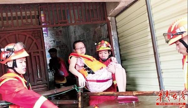 7月8日,耒阳市蓝天市场,消防员用竹床转移受困的孕妇。 刘慧云 黄呈党 摄影报道