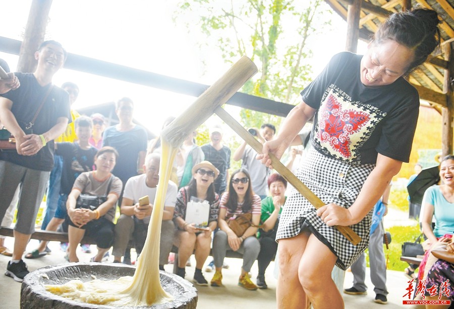 7月7日,慈利县三官寺土家族乡罗潭村禾田山谷,游客在体验打糍粑。当天,为期三天的2019“硒有慈利”千人百车自驾消费扶贫红色之旅活动拉开帷幕,来自湖南、湖北、江西、贵州等地的近千名游客,在慈利县万福温泉、朝阳地缝、樟树村红军树等景区体验风土人情,购买农副产品,助力精准扶贫。
