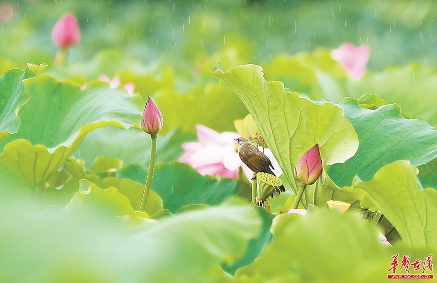 7月7日,衡阳市雁峰区南湖公园,一只小鸟在荷叶下“避雨”。当天是二十四节气中的“小暑”,全省多地迎来降雨。罗盟 摄