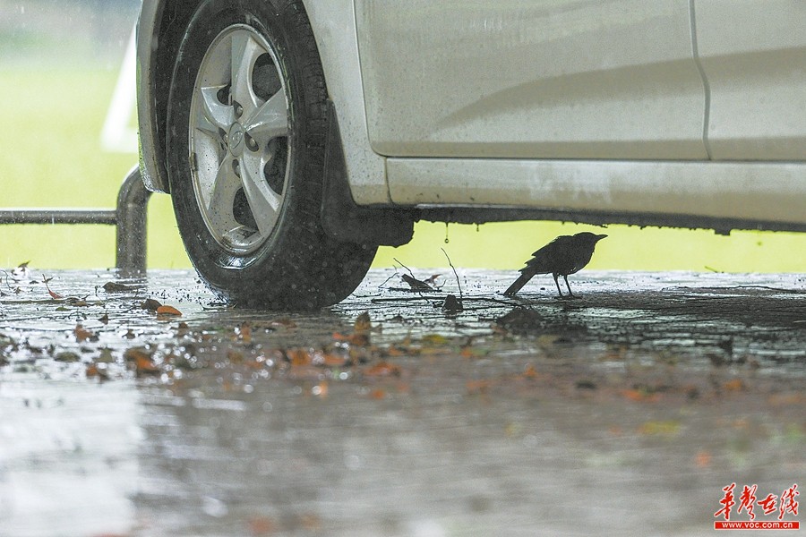 7月7日,中南大学铁道校区,一只被淋湿的小鸟在车下躲雨。当天10时起,湖南省气象局启动暴雨Ⅳ级应急响应。湖南省气象台预计,未来10天湖南雨日较多,进入降雨集中期。湖南日报·华声在线记者 辜鹏博 摄