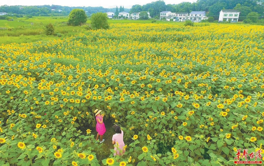 7月7日,长沙市望城区桥驿镇群力村,成片的油葵进入盛花期,游客慕名前来赏花拍照。近年,群力村因地制宜探索出“三花双油”的农业新模式,上半年种植油葵,下半年种植油菜,中间过渡阶段栽种各色花卉,吸引周边游客,发展旅游带动村民经济增收。去年,共有10余万人次游客前来观光游玩,为该村村民带来了近40万元的旅游收入。