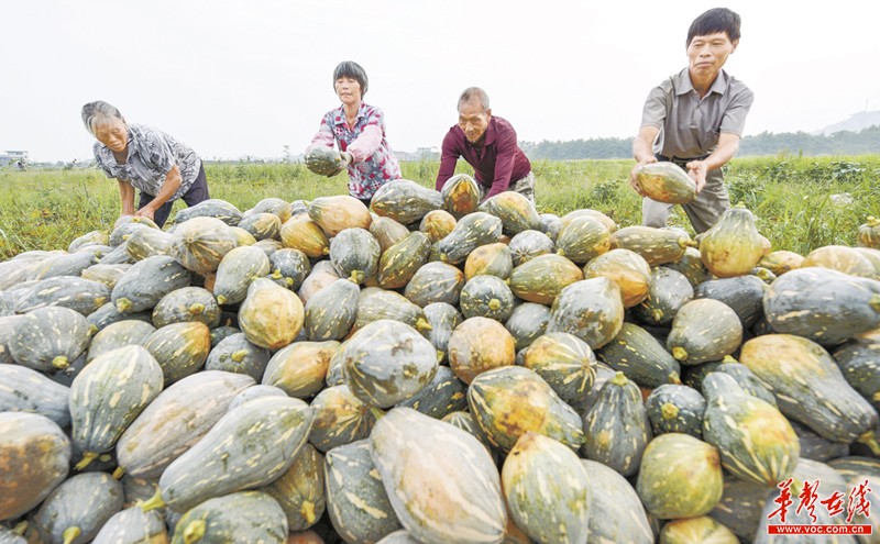 7月3日,道县营江街道岗下村,农户在采收香芋南瓜。近年来,营江街道结合当地自然资源优势,大力发展南瓜、辣椒、青菜、秋西瓜等果蔬“接茬轮作”种植,实现农民增收,土地增效。