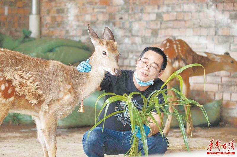 7月2日,东安县舜管局西岭工区银杏园鹿苑,饲养员在给梅花鹿喂食。近年来,东安县发展特色养殖,建立梅花鹿养殖基地,通过“企业+景区+农户”经营模式,让更多人分享梅花鹿产业红利,带动群众增收致富。