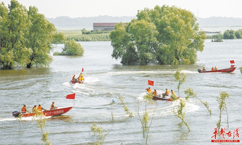 7月2日,岳阳市君山区东洞庭湖丁子提水域,民兵正进行抗洪抢险应急救援演练。6月20日开始,君山区人民武装部组织民兵应急连开展了为期12天的冲锋舟操作训练。训练内容涵盖操舟机操作使用、故障排除,冲锋舟离岸靠岸、队形变换等科目,提高民兵遂行紧急任务的能力。 刘清海 摄