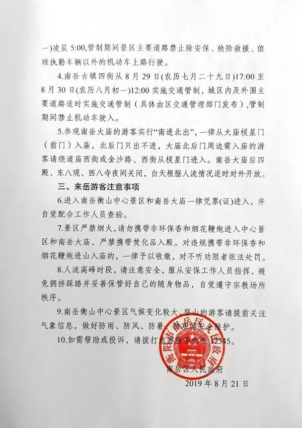 所以,8月30日(农历八月初一)5:00前进入中心景区的游、香客请选择合适的步行登山线路,走景区主道并备好照明工具。