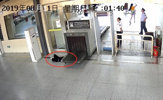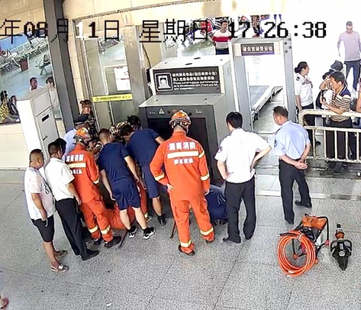 8月11日,新化火车站安检口,5岁男孩小晏手卡安检传送带,20多分钟后安全获救。 通讯员 供图