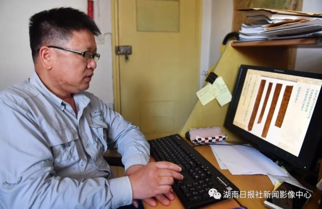 湖南省文物考古研究所研究员张春龙在对益阳兔子山遗址发掘出土的简牍进行研究。