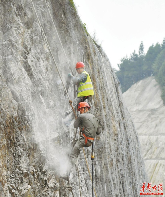8月9日,G319国道花垣县麻栗场镇路段改道建设现场,施工人员在悬崖上加固边坡。入夏以来,该项目施工人员冒着高温酷暑,推进施工。龙恩泽 摄