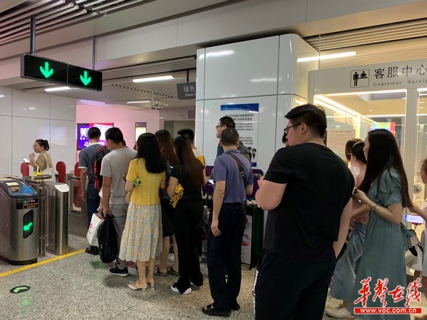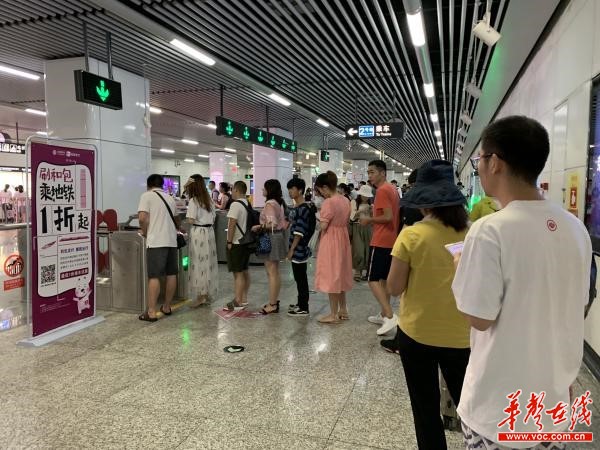 7月30日晚高峰时段,长沙地铁2号线芙蓉广场站手机刷卡闸口,乘客们正在排队进站。