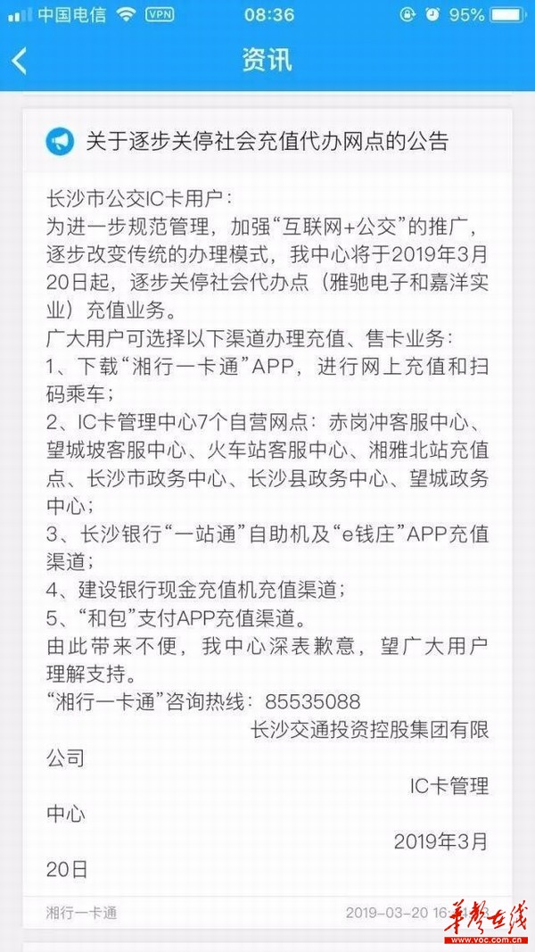 记者查询了解到,长沙市交通投资集团IC卡管理中心从今年3月20日起,就逐步关停了公交卡社会代办点充值业务,只保留了部分社会代办点。长沙交通投资控股集团有限公司在2019年3月曾发布《关于逐步关停社会充值代办网点的公告》,公告公布了目前公交卡办理和充值的5种渠道。