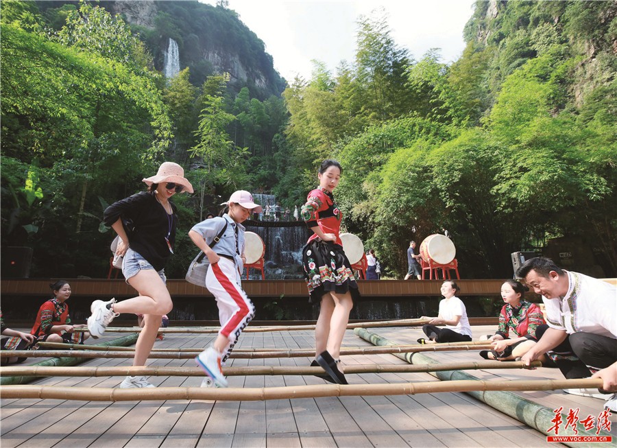 8月5日,张家界武陵源宝峰湖景区,游客在体验竹竿舞。进入暑期旅游旺季以来,前来张家界避暑度假的游客与日俱增。该景区在游人集散地开展跳摆手舞、打苗鼓、唱山歌等多彩民俗文化展演,让广大游客观赏山水,乐享民俗。
