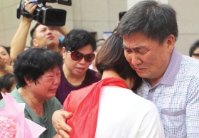 “你怎么现在才回来啊?”在人群的簇拥下,今年30岁的曹明月走向了自己的亲生父母曹国选和李满花,李满花抱着女儿嚎啕大哭起来。曹国选站在一旁张罗着,面部平静。
