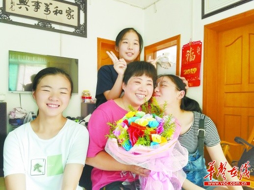 8月1日,刚刚考上娄底幼师和新化县一中的3位“女弟子”返回校园看望王赛花(前中)。 湖南日报·华声在线记者 陈惠芳 何国庆 摄影报道
