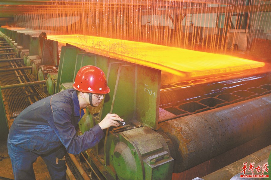 8月1日,湖南华菱湘潭钢铁有限公司,工人在5米宽厚板厂轧钢车间对中间水冷设备进行点检。7月31日,湖南省气象台发布高温黄色预警,省内各地高温持续,该公司工人坚守在高达45℃的生产一线挥洒汗水,保障生产。