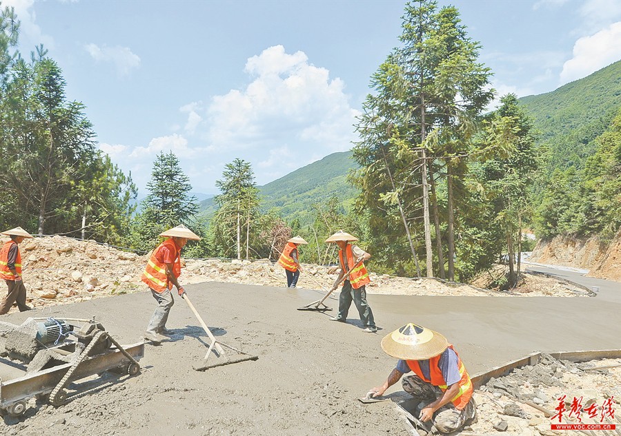 7月29日,溆浦县中都乡长丰村,村民对通组公路进行硬化施工。近年来,该村新建、拓宽、硬化公路27公里,新建桥梁2座,把贫困山村“慢交通”变为“畅交通”,助力美丽乡村建设和乡村振兴。