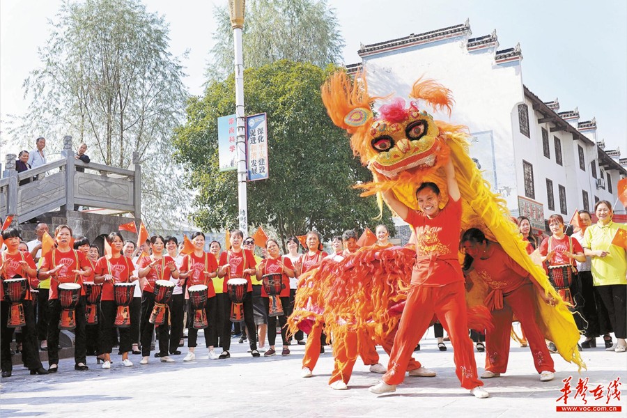 9月29日,洞口县高沙镇长裕社区,群众挥舞着五星红旗,敲锣打鼓,舞狮庆祝新中国成立70周年。当天,该镇举行“共祝祖国好,幸福舞起来”群众联欢活动,迎接中华人民共和国70周年华诞。