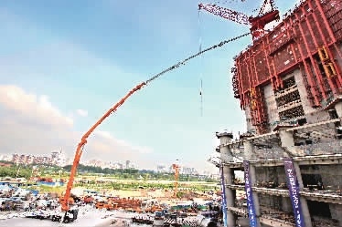 2013年7月,中联重科自主研发的全球最长101米碳纤维臂架泵车在武汉中心(438米)施工。