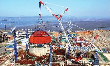 国内应用最大吨位履带起重机——中联重科3200吨履带起重机起吊福建福清核电站“华龙一号”穹顶。