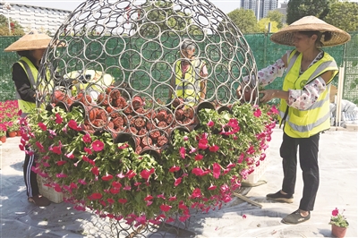 当天上午,城区魏源广场上,市苗木花卉科学研究所组织10余名园林工人,开展搬运鲜花、修剪鲜花造型、浇水等工作,加快大型摆花布置作业。施工现场,摆花造型已初步成型,西洋杜鹃、一品红、三角梅、矮牵牛花等红色鲜花含苞欲放,与摆花的主打绿雕“祖国万岁”相互映衬,十分靓丽。