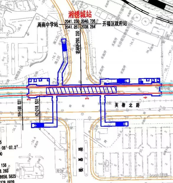 (5)湘绣城站位于芙蓉北路与植基路交汇处,站台宽度为12m。站点周边为城北车管所、市地方海事局、鸿图园小区、联运物流。