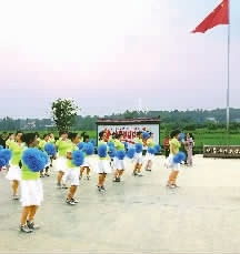 过了一会儿,广场上响起节奏明快的音乐,几十个身着黄白套裙的妇女跟着王利平舞动起来。不少居民闻声而来,广场上传来热闹的欢笑声……