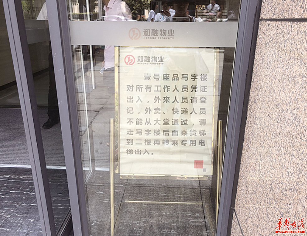 钟先生所言是否属实?9月10日中午,记者提着2个用纸袋封好的外卖,来到壹号座品B座尝试送餐。记者看到,在该楼入口右侧摆放的一块指示展板提示,“外卖、快递人员不能从大堂通过,请走到写字楼后面乘货梯到二楼再转乘专用电梯出入。”