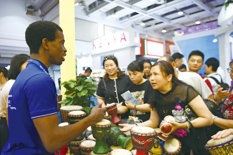 2019年6月28日,在湖南国际会展中心的中非经贸博览会展厅,加纳共和国展位的工作人员在向参观者介绍手鼓。新华社 图