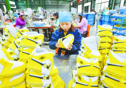 10月25日,道县工业集中区厂房内,来自贫困村的村民在加工运动鞋。近年,该县建立健全县、乡、村三级劳务协作服务网络,架起贫困劳动力与用工单位的桥梁,助力贫困劳动力转移就业,促进脱贫增收。