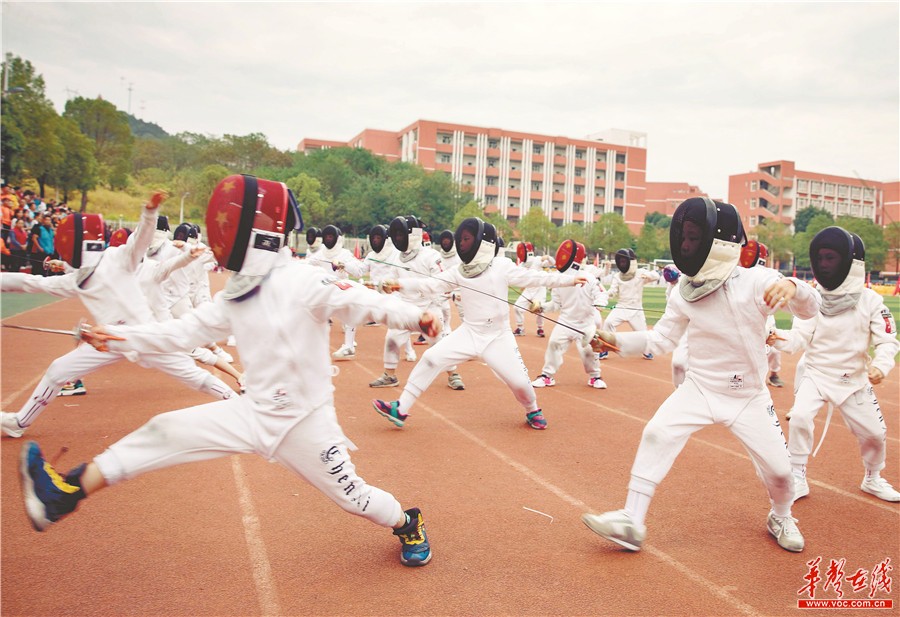10月22日,长沙市青竹湖湘一外国语学校,学生们在进行击剑操展演。当天,该校举办第十四届校运会暨校园体育文化节开幕式,通过运动项目展演、“伴你奔跑,陪你长大”亲子越野跑等活动,培养学生力学笃行品行,激发学生运动热情。