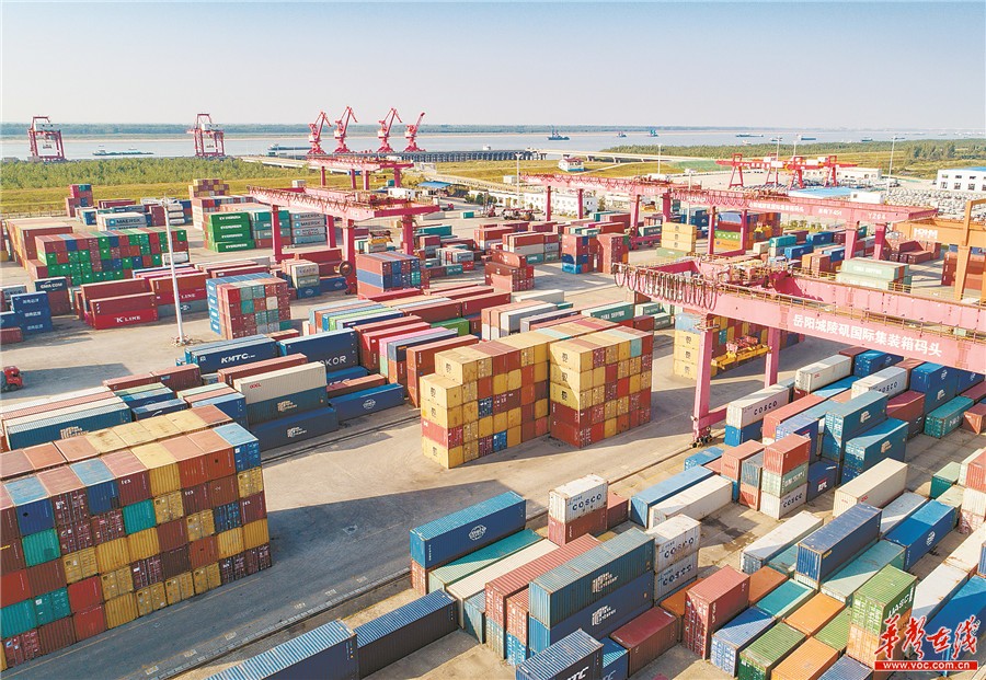 10月19日,岳阳城陵矶国际集装箱码头里整装待发的集装箱。今年来,岳阳城陵矶口岸高起点布局推进航运物流发展,加快打造长江中游地区江海联运重点中转枢纽港口。前三季度,城陵矶口岸集装箱吞吐量38.4万标箱,同比增长4.63%;进口汽车整车6126台,同比增长286%;进口集装箱粮食20.83万吨,同比增长12.29%,口岸经济持续飘红。