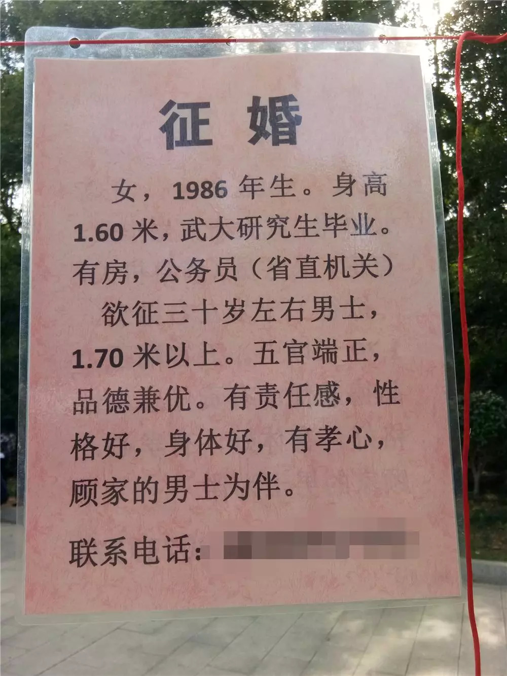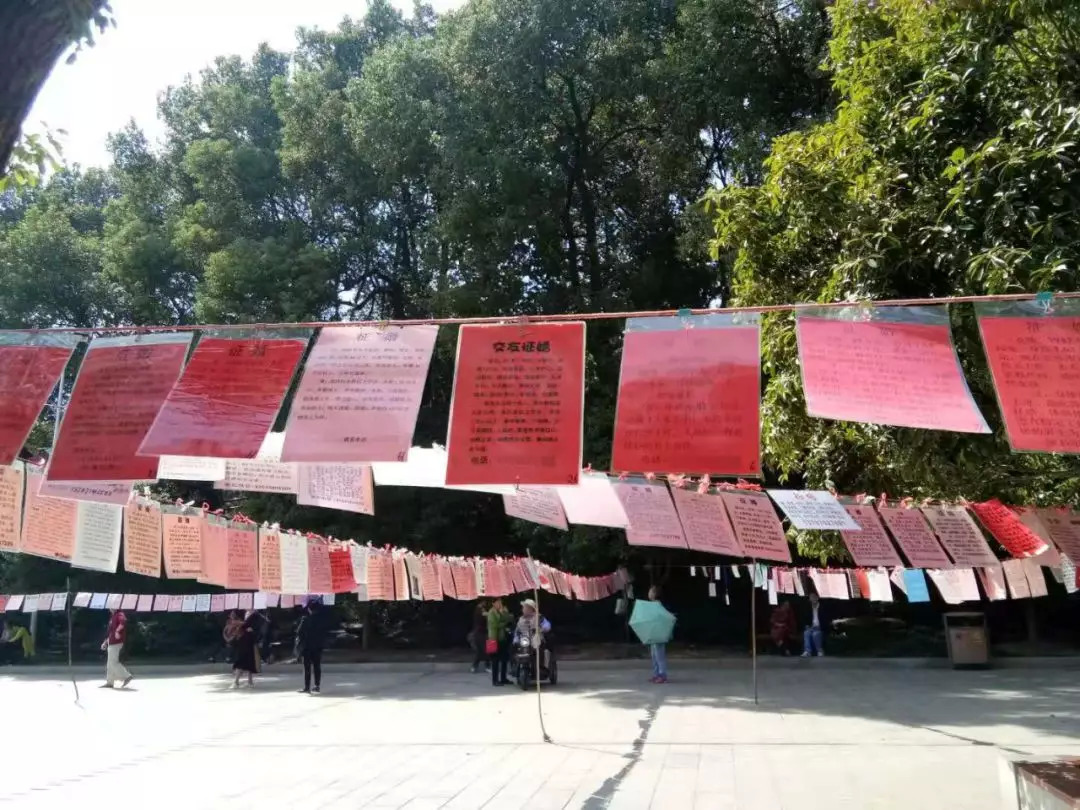这是一个百多平米的广场,两旁各种着一溜大树,一根根红绳从这头牵到那头,绳上系着一排排征婚启事。