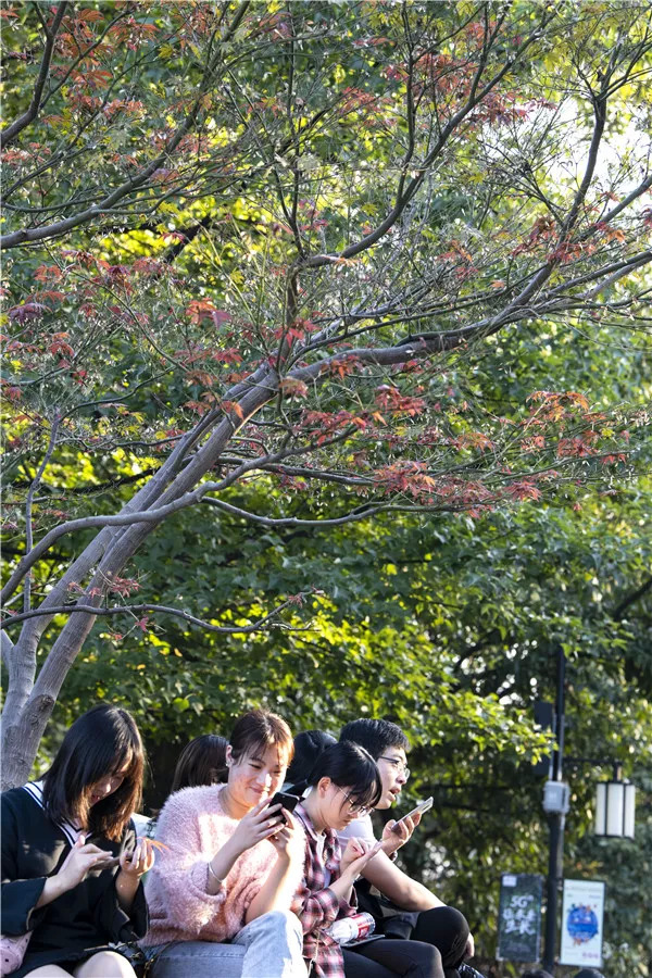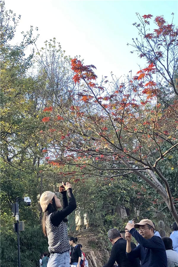 一叶知秋,10月20日,天气晴朗的长沙城又像打开了人流的闸门一样,人们成群结队地涌向了岳麓山、橘子洲、省植物园等公园景点,想要努力抓住这短暂的秋日时光。岳麓山顶上的一棵鸡爪槭也露出了红叶,引得不少游客举手机拍照,想要将这红叶、蓝天和阳光都保存在手机里。