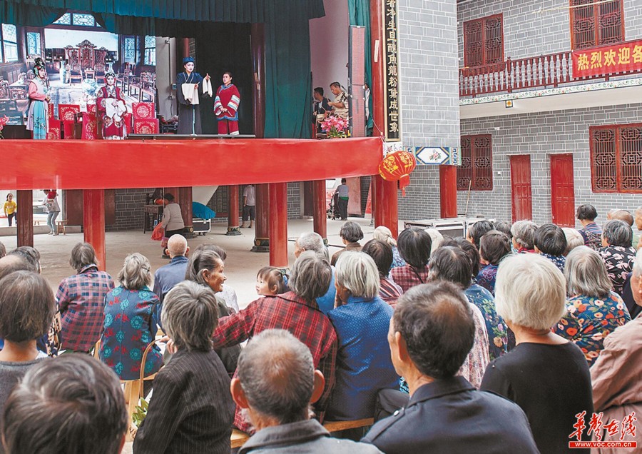 10月6日,村民在观看古典戏演出。当天,洞口县高沙祁剧团在石桥村开展送戏下乡活动,弘扬传统文化,丰富村民的精神文化生活。
