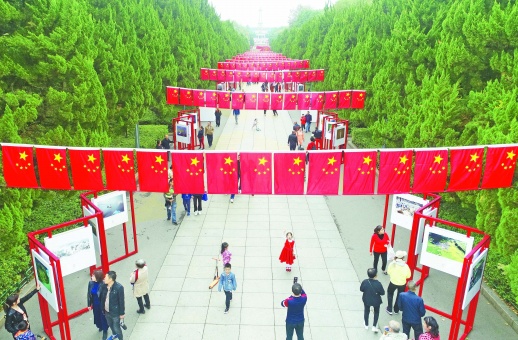 10月7日,湖南烈士公园,游人在观看“爱上湖南”摄影展。影展从我省经济建设、环境改善和衣食住行等方面,生动展现了70年来三湘大地所发生的翻天覆地的变化,吸引众多市民和游客驻足观看。