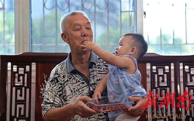 9月17日,衡阳市珠晖区检察院家属区,一岁多的外孙女在给邓国庆老人喂葡萄吃,其乐融融。湖南日报·华声在线记者 李健 摄