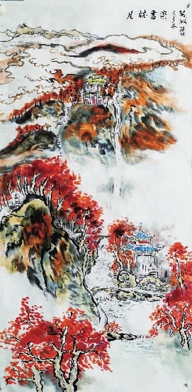 严淞这幅岳麓山,看上去也似“图真不可及”。从爱晚亭上云麓宫那条路,掩映在绿树丛中,很难清楚地看得到。他却让观者看得到并画得让人想去走一走;那条弯弯曲曲掩映于绿树下的溪流,则被他画成细细长长的瀑布一般。岳麓山上的红枫,被他画得如火焰一样。他这“层林尽染”,真是“染”得大胆!但这座岳麓山,不会被人认为是南岳或华山或庐山。因为那爱晚亭、云麓宫真真实实地立在那里,是别处名山所没有的“物象”。这一独特地标让人相信这是岳麓山而绝非庐山。