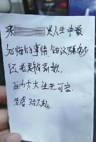 吴女士在控诉书中指称,11月11日上午,她被告知张某在宿舍自杀身亡,警察在现场发现一张纸条,上面潦草地写着几行字,“来新环境是人生中最后悔的事,钱没赚多少,还老是被罚款,压力太大生无可恋,老婆对不起”。