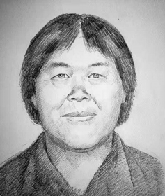山东退休警官林宇辉画的灰色素描“梅姨”画像。