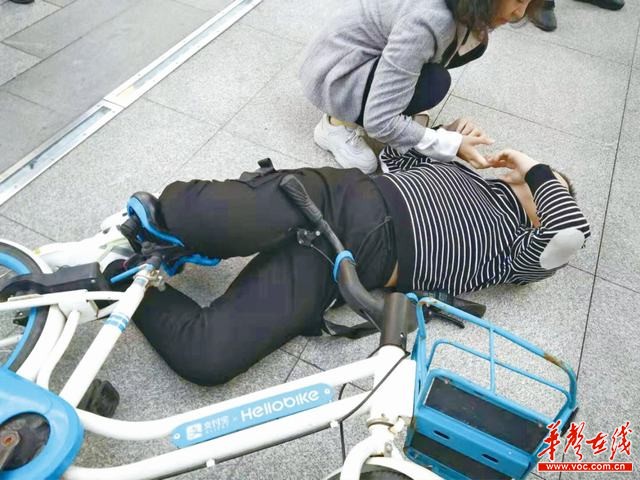 11月15日,新湖南大厦前坪,一名11岁的男孩骑共享单车摔倒,车把扎进大腿。记者 张洋银 摄