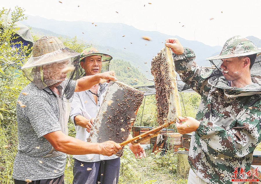 11月5日,临武县水东镇小城村,村民袁子钦(右)向蜂农传授虫害控制经验。他于2016年成立蜜蜂养殖专业合作社,免费向社员提供蜂种并传授养殖技术,通过电商平台销售蜂产品,带动了周边18名村民脱贫致富。