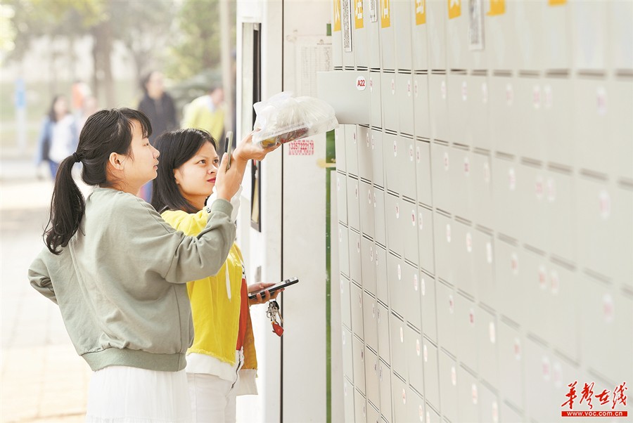 11月4日中午,长沙理工大学云塘校区敏行轩学生宿舍外,大学生从外卖柜取餐。本学期起,该校后勤餐饮中心在校内5个宿舍点安装食堂外卖消毒保温柜,学生点餐后,送餐员将餐品及时投递至柜内。