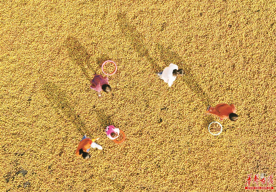 11月4日,道县上关街道向阳村,村民在晾晒分选油茶果。金秋时节,该县12.7万亩高产示范油茶基地进入丰收采摘期,当地农民利用晴好天气抓紧采摘、晾晒油茶果。近年来,该县立足资源条件和产业基础,坚持把油茶产业作为富民工程来实施,走出了一条“生态美、产业兴、百姓富”的油茶产业发展之路。