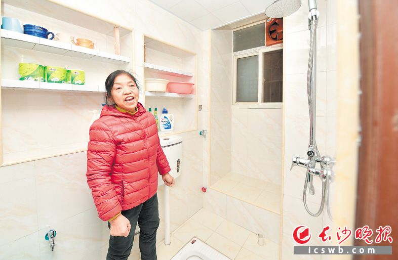 12月24日,天心区白沙井社区红龙庙小区25栋的王娭毑家,原来臭水横流的厕所改造一新,王娭毑高兴不已。长沙晚报全媒体记者 邹麟 摄