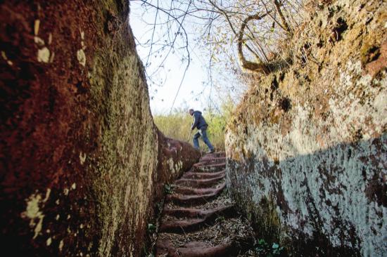 ▲河里寨寨门后的甬道,系在一块巨石上凿穿而成。