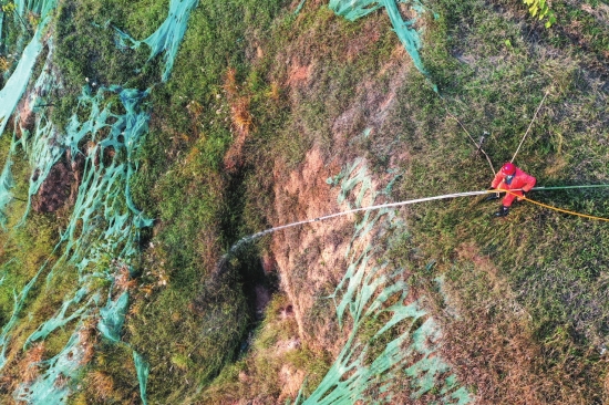 12月13日,长沙跳马镇龟坡废弃矿山,工人正在矿山边坡上浇水。它是长沙绿心第一个已完 成的矿坑生态修复项目。 图/记者金林