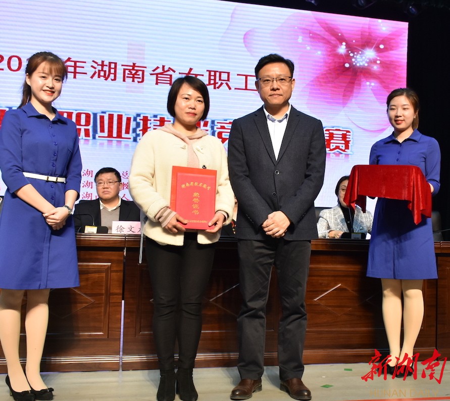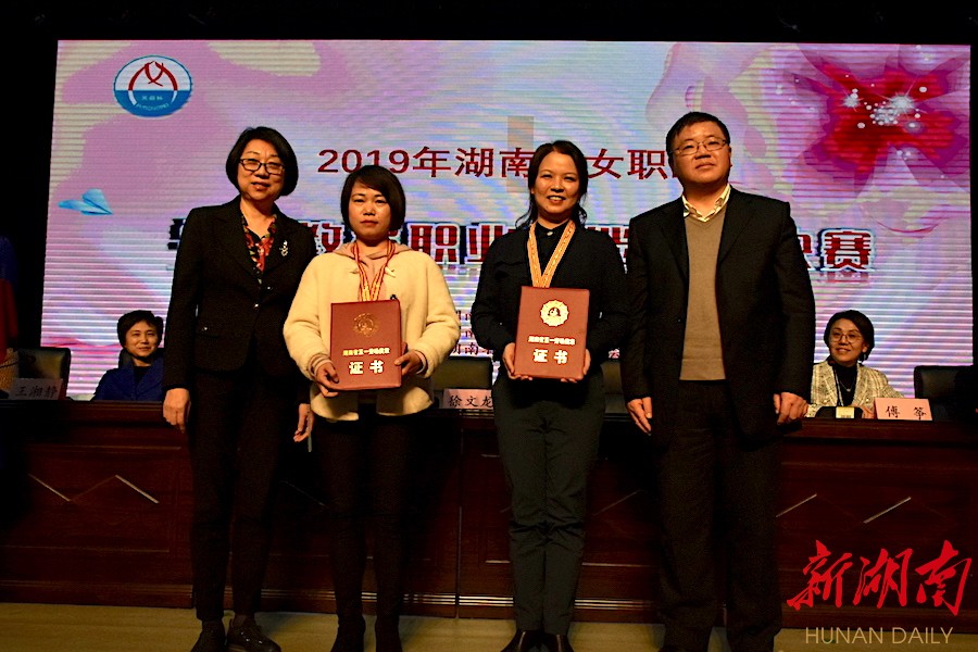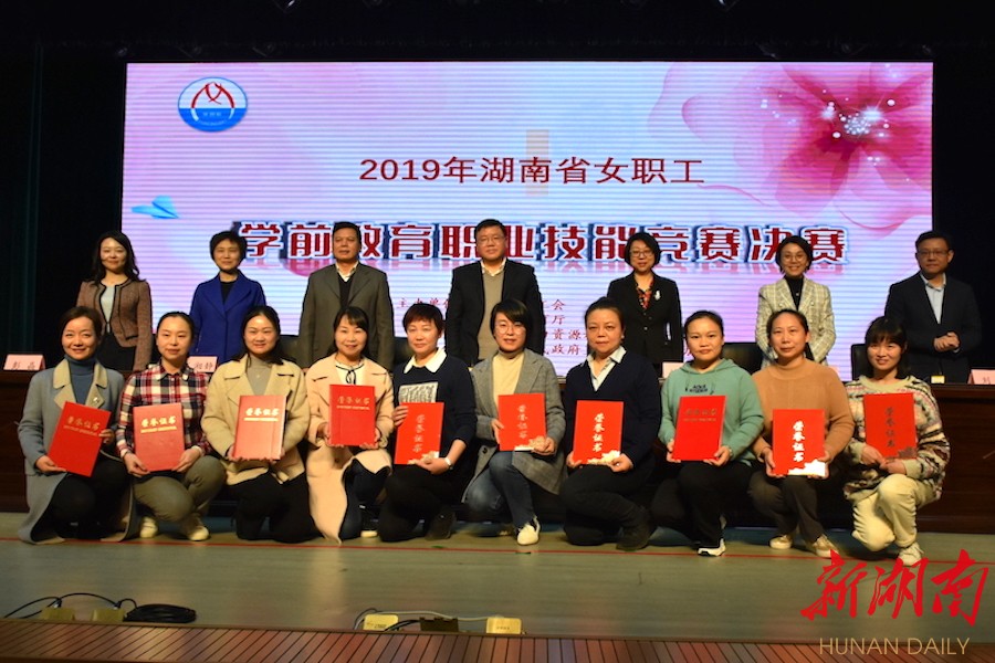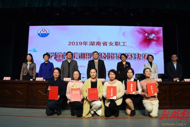 闭幕式现场,湖南省总工会授予吕奕、王坤“湖南省五一劳动奖章”,湖南省人社厅授予王坤“湖南省技术能手”。长沙等14个代表队获得“2019年全省女职工学前教育职业技能竞赛优秀组织奖”。