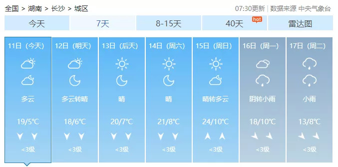 根据长沙市气象台预报,长沙未来一周没有大风天,没有雨水到访,12日至16日,天气晴朗,最高气温升至22℃左右。