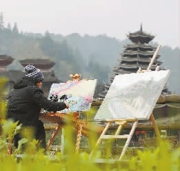 2月24日, 通道侗族自治县坪坦乡横岭村,美术爱好者在创作。粟勇主 摄
