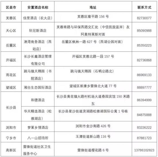 昨日,长沙市新型冠状病毒肺炎防控指挥部、长沙市防病工作领导小组公布对疫源地人员开放定点服务场所的名单。也就是对于湖北省来长人员,在排查无发热、咳嗽等疑似症状后,长沙各区县市给予适当帮助,统一征用酒店,统一进行医学观察和隔离。