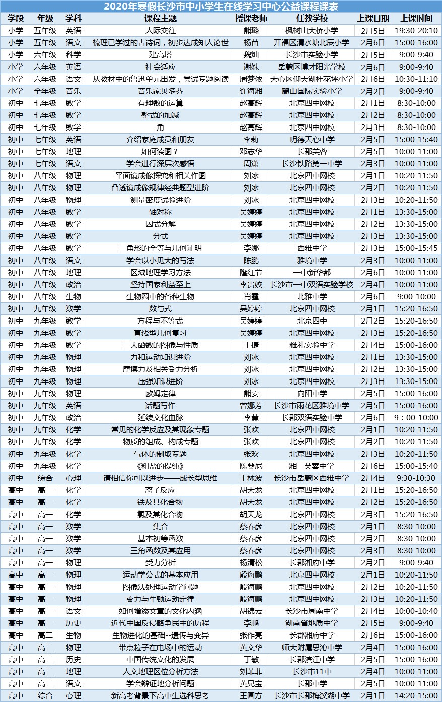 从长沙市教育科学研究院公布的2020年寒假长沙市中小学生在线学习中心公益课程课表中,记者发现,课程将从2月1日持续到2月6日,学段包括小学、初中和高中,学科涉及语文、数学、英语、物理、科学、音乐、心理等,任教学校除了湖南省内名校外,还有外地学校,首堂课将于2月1日8点30分开讲,课程主题为七年级数学《有理数的运算》,由北京四中网校老师赵高辉授课。